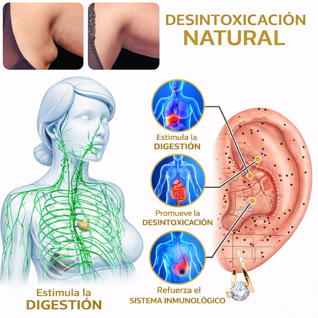 Esta imagen presenta una infografía promocional enfocada en la desintoxicación natural y el bienestar corporal, asociada al uso de aretes colocados en puntos específicos de la oreja.Se muestran diagramas del cuerpo humano y del sistema linfático junto con ilustraciones del oído, destacando supuestos efectos como la estimulación de la digestión y el refuerzo del sistema inmunológico.Además, incluye imágenes comparativas y gráficos explicativos que sugieren mejoras físicas mediante la activación de zonas corporales relacionadas con la oreja.