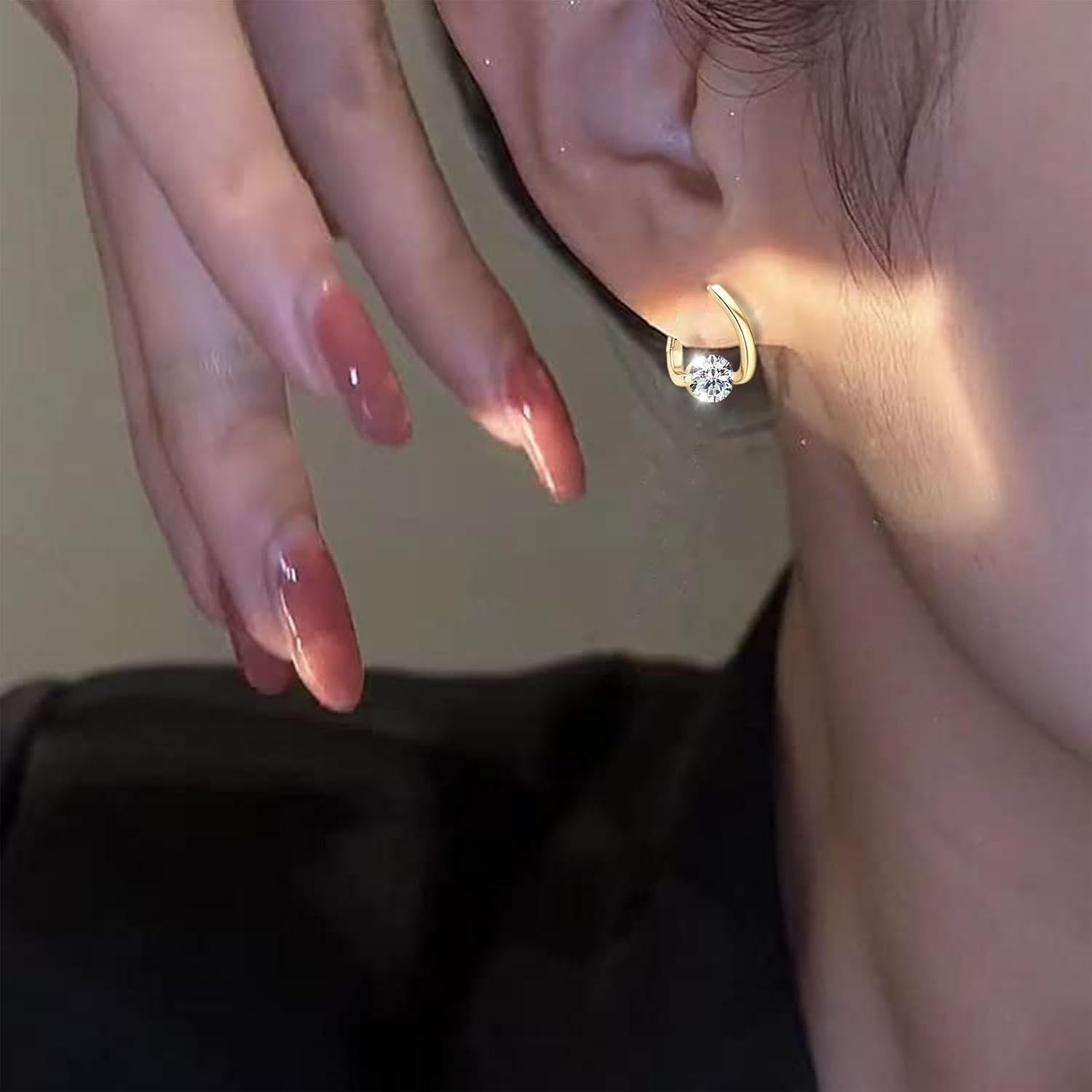 Esta imagen presenta un primer plano elegante que resalta el uso de un arete dorado como detalle principal, mostrando la oreja de una mujer con iluminación suave y cuidada.El diseño del arete, con una piedra brillante de corte redondo, destaca por su delicadeza y acabado pulido.La composición y el gesto natural de la mano aportan una sensación de sofisticación y estilo moderno, ideal para un contexto de moda y joyería.